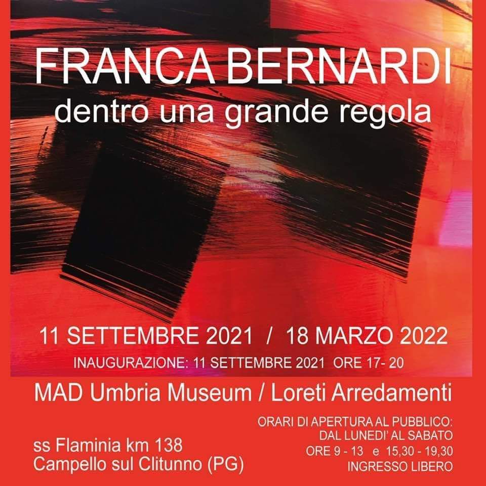 Il giorno 11 Settembre 2021 dalle 17:00 alle 20:00, presso il  MAD Umbria Museum situ all’interno del centro Loreti Arredamenti verrà inaugurata la mostra dell’artista Franca Bernardi “Dentro una grande regola”.